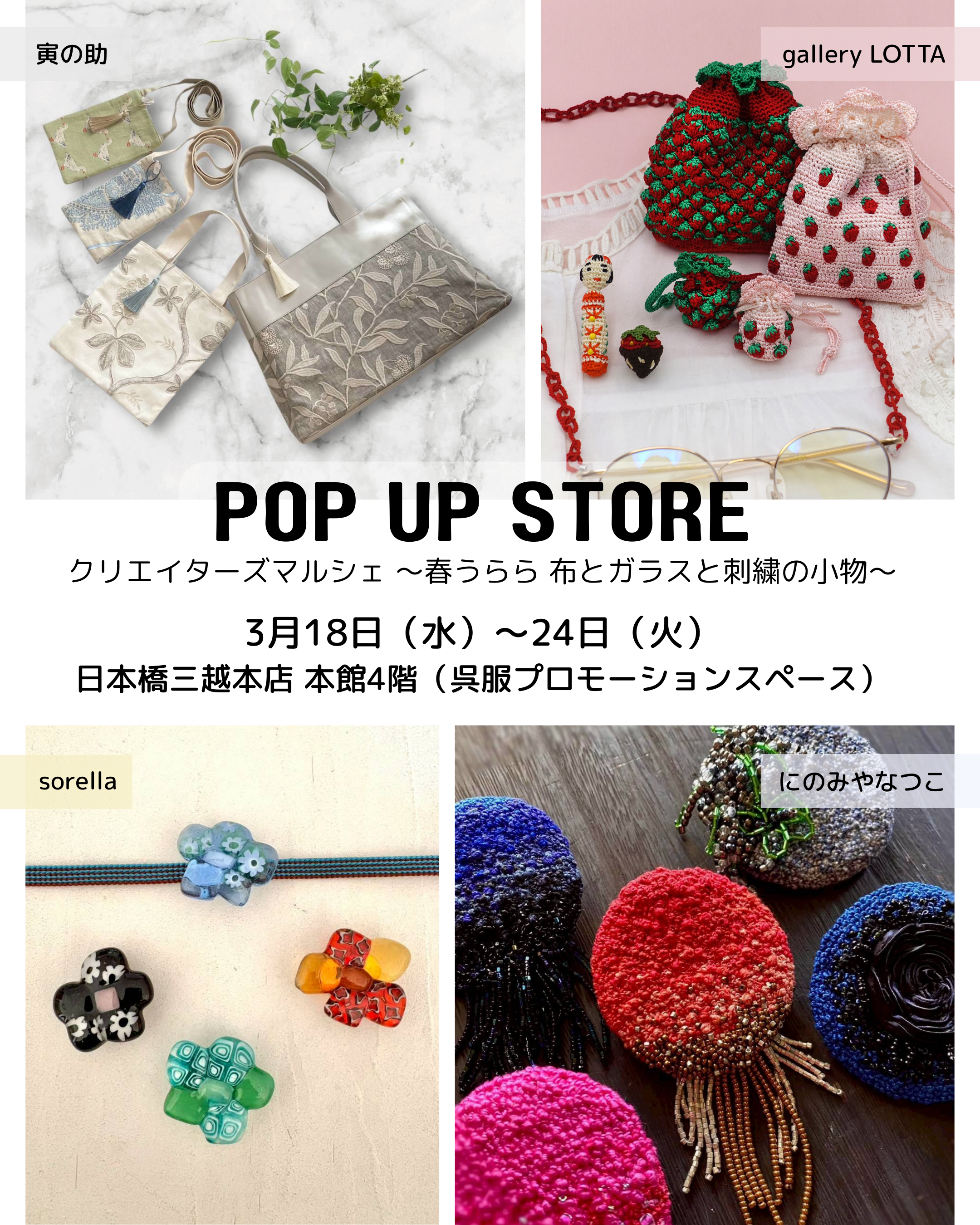 - 寅の助(風呂敷バッグと布のバッグ)、sorella(ベネチアンガラスアクセサリー)、にのみやなつこ(刺繍小物)、gallery LOTTA(かぎ針編み小物)